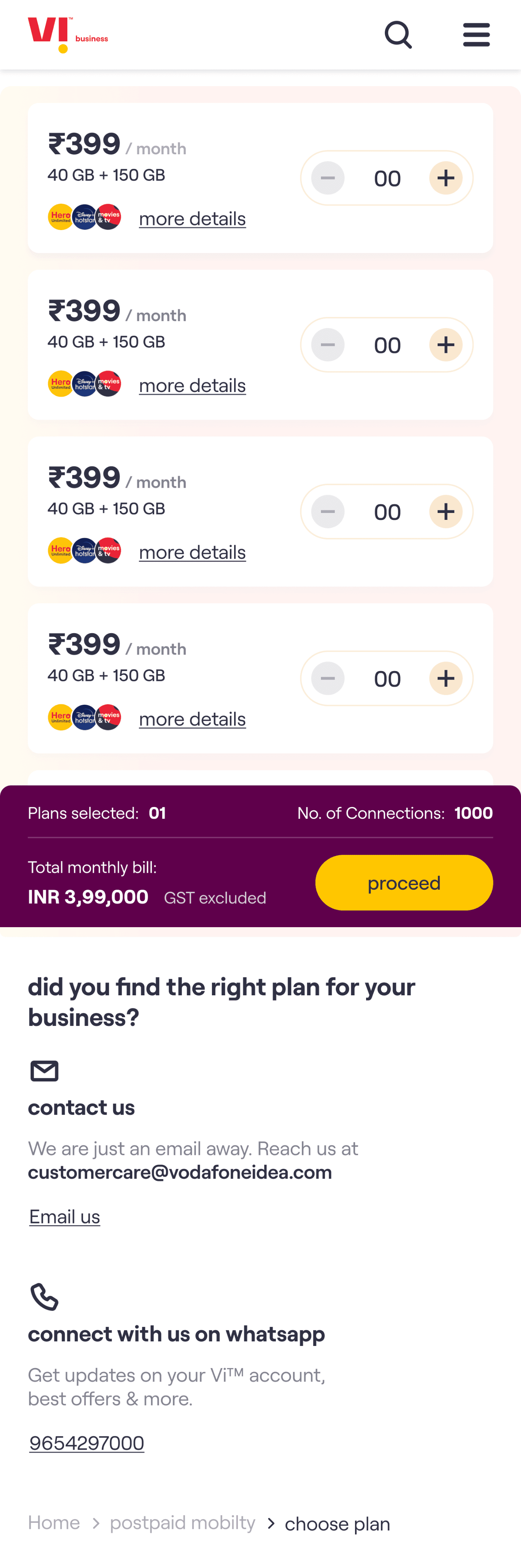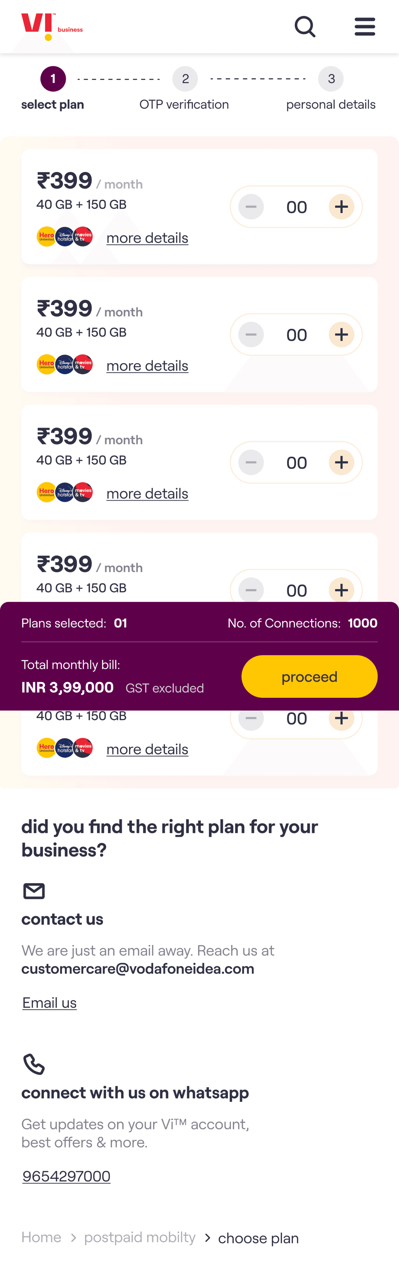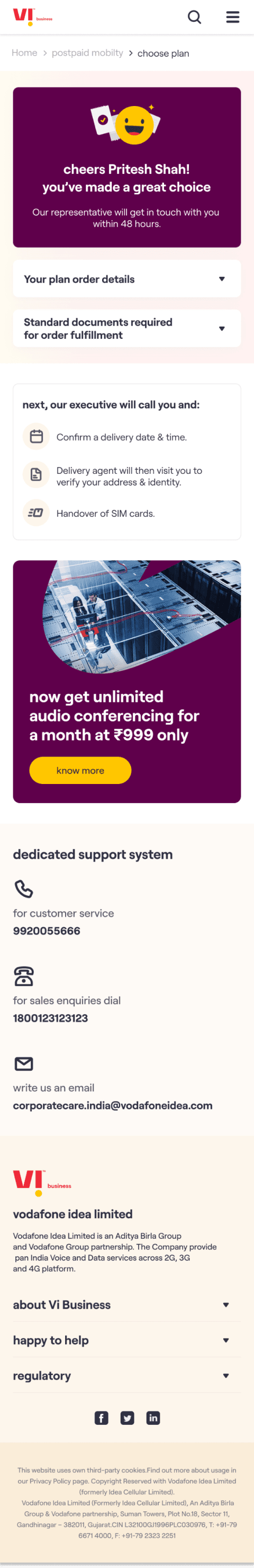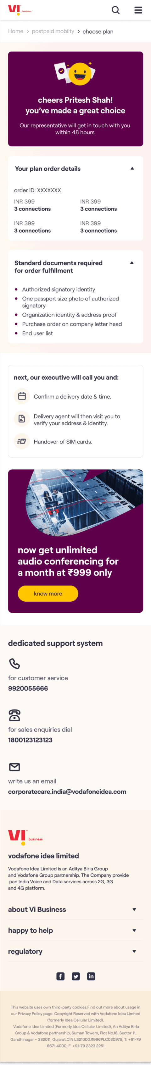 The core experience enables a customer to choose a plan, select the number of connections required & on submission of the request receive an acknowledgement email. The customer’s needs are then fulfilled by Vi Business team.