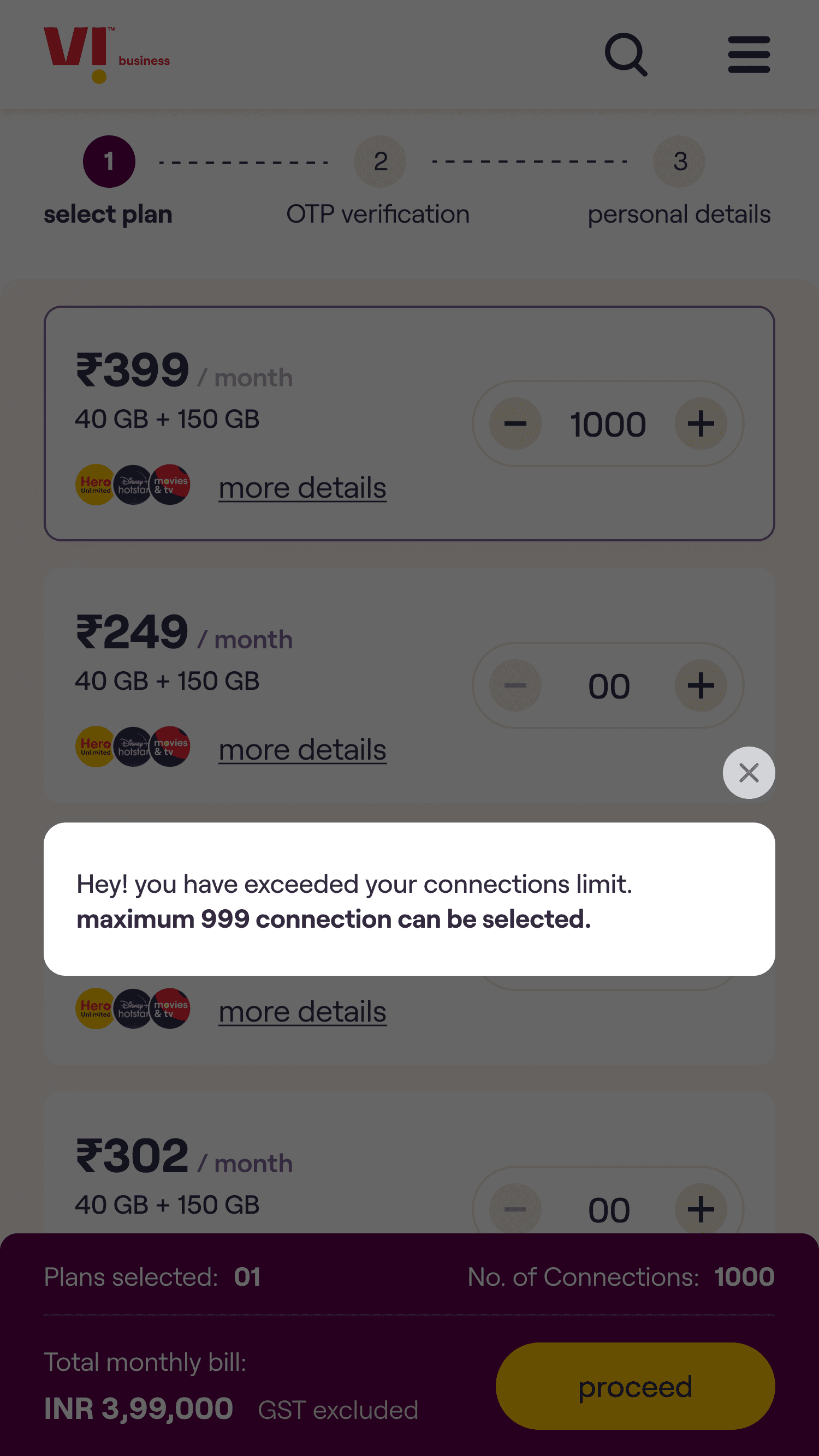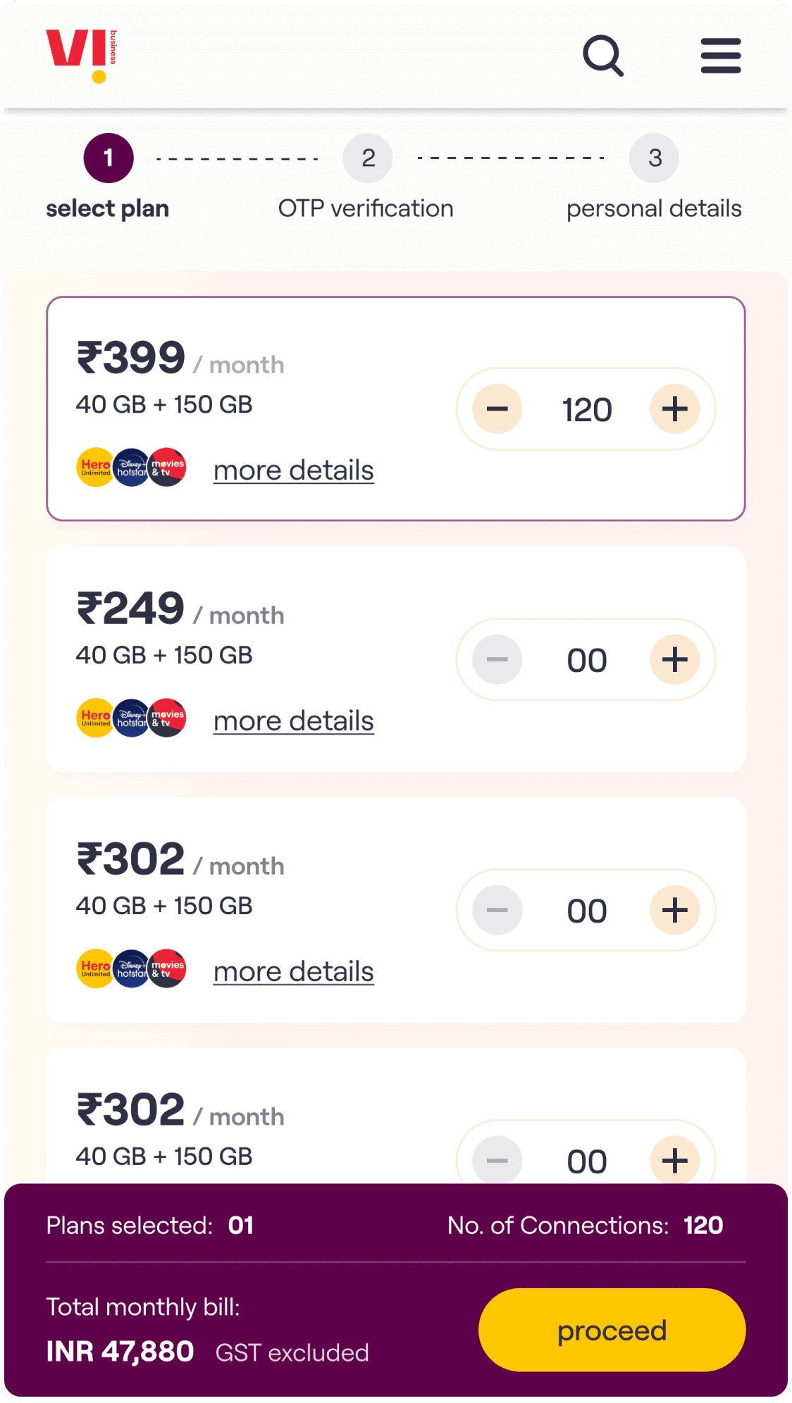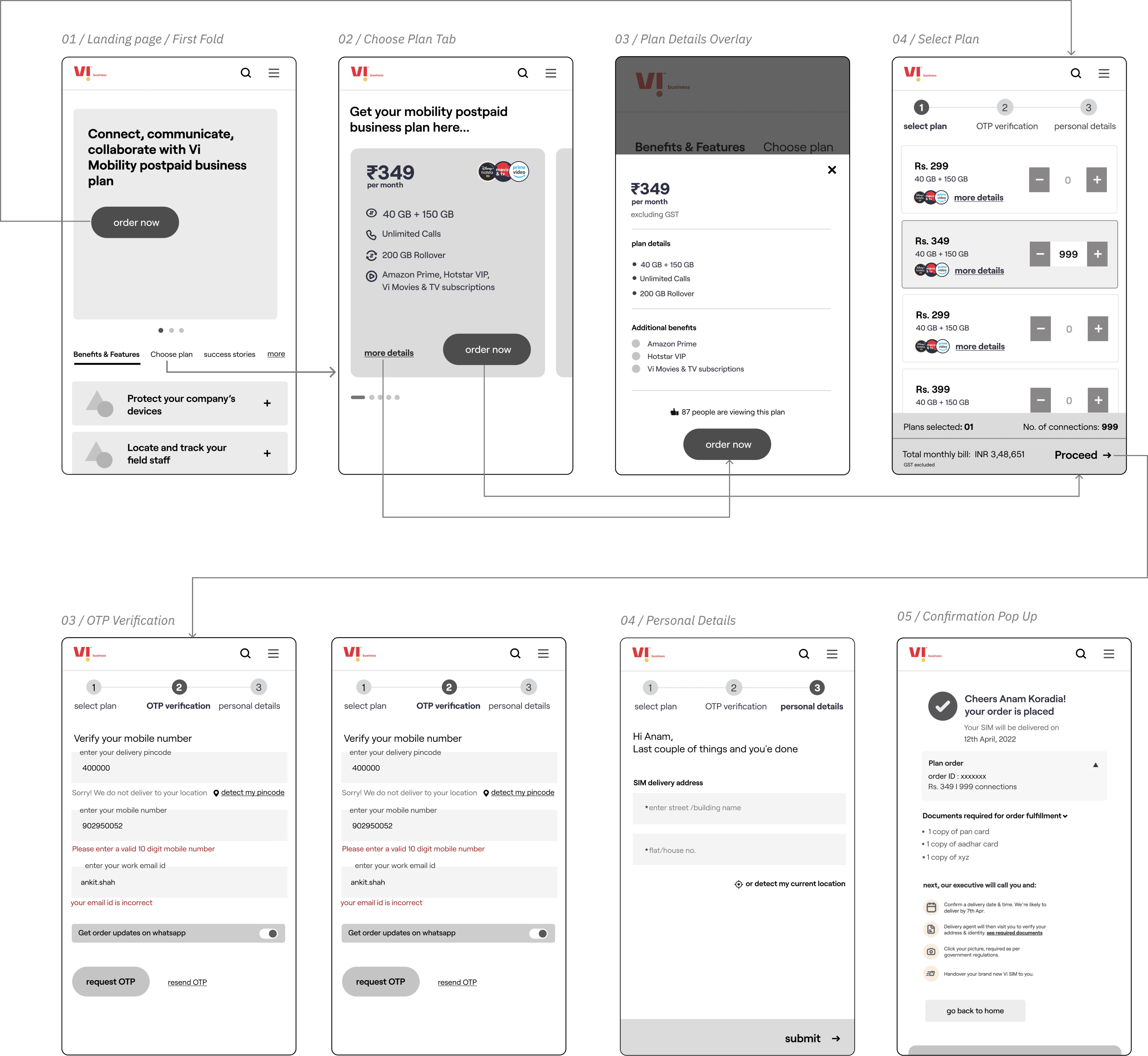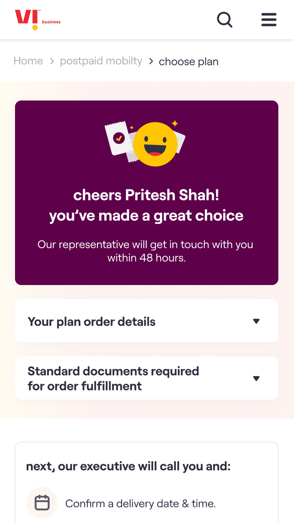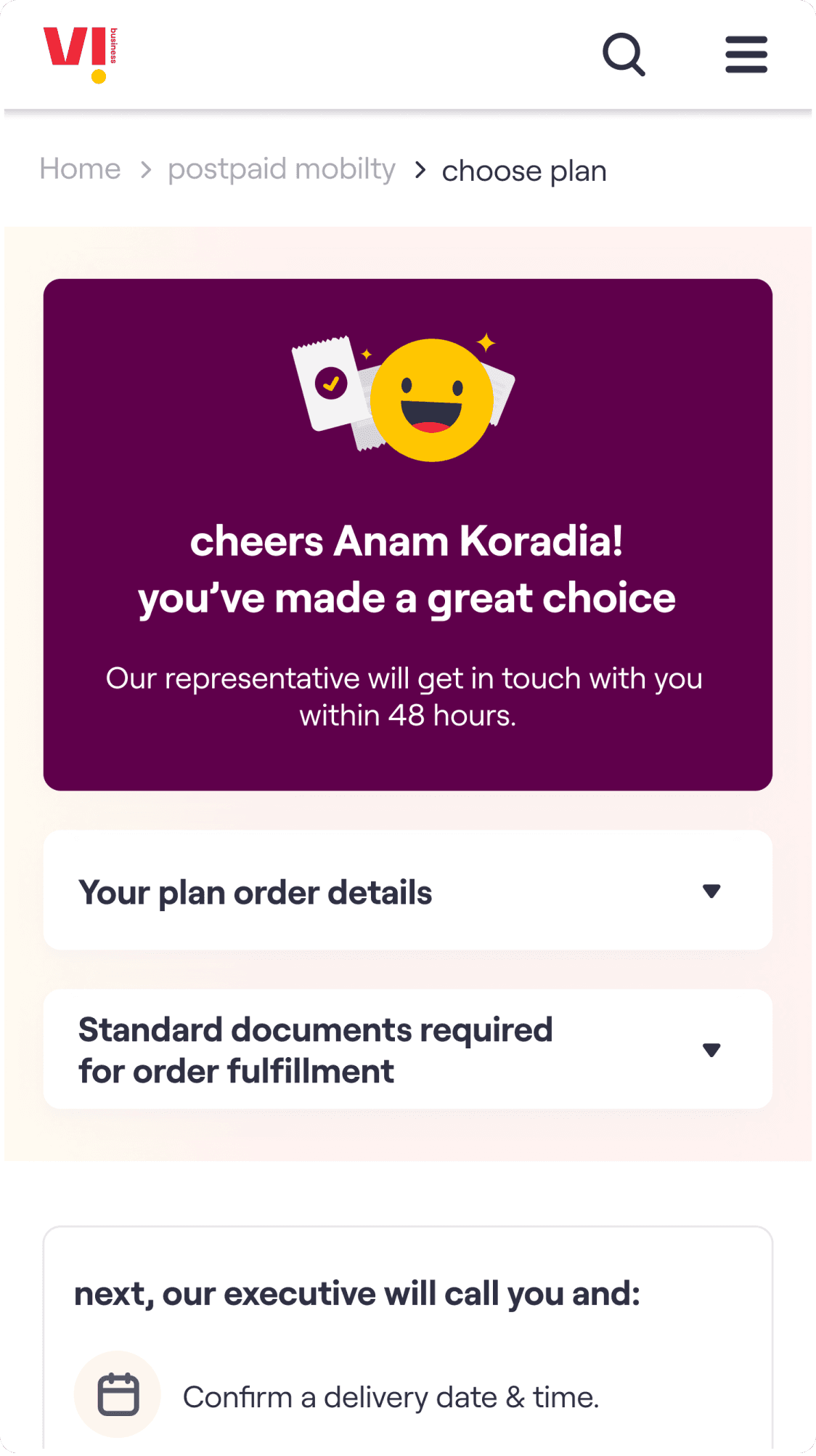 The core experience enables a customer to choose a plan, select the number of connections required & on submission of the request receive an acknowledgement email. The customer’s needs are then fulfilled by Vi Business team.