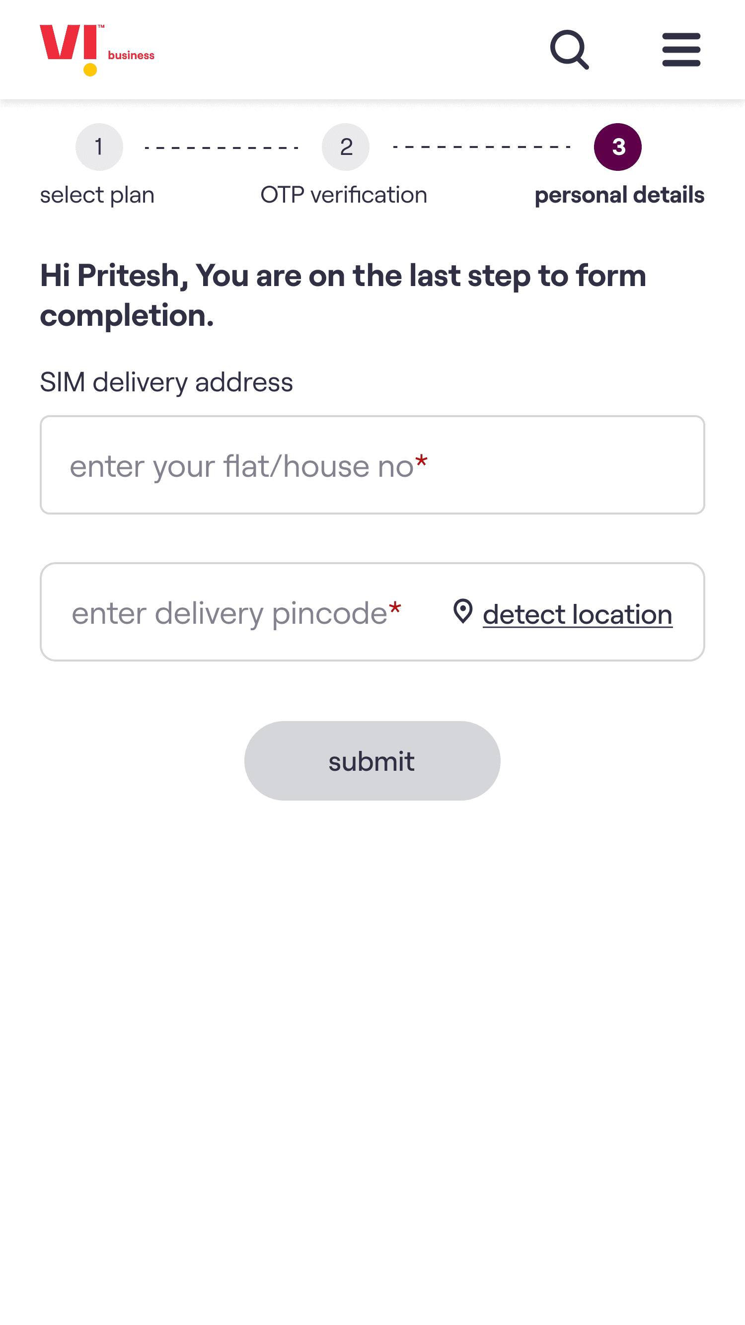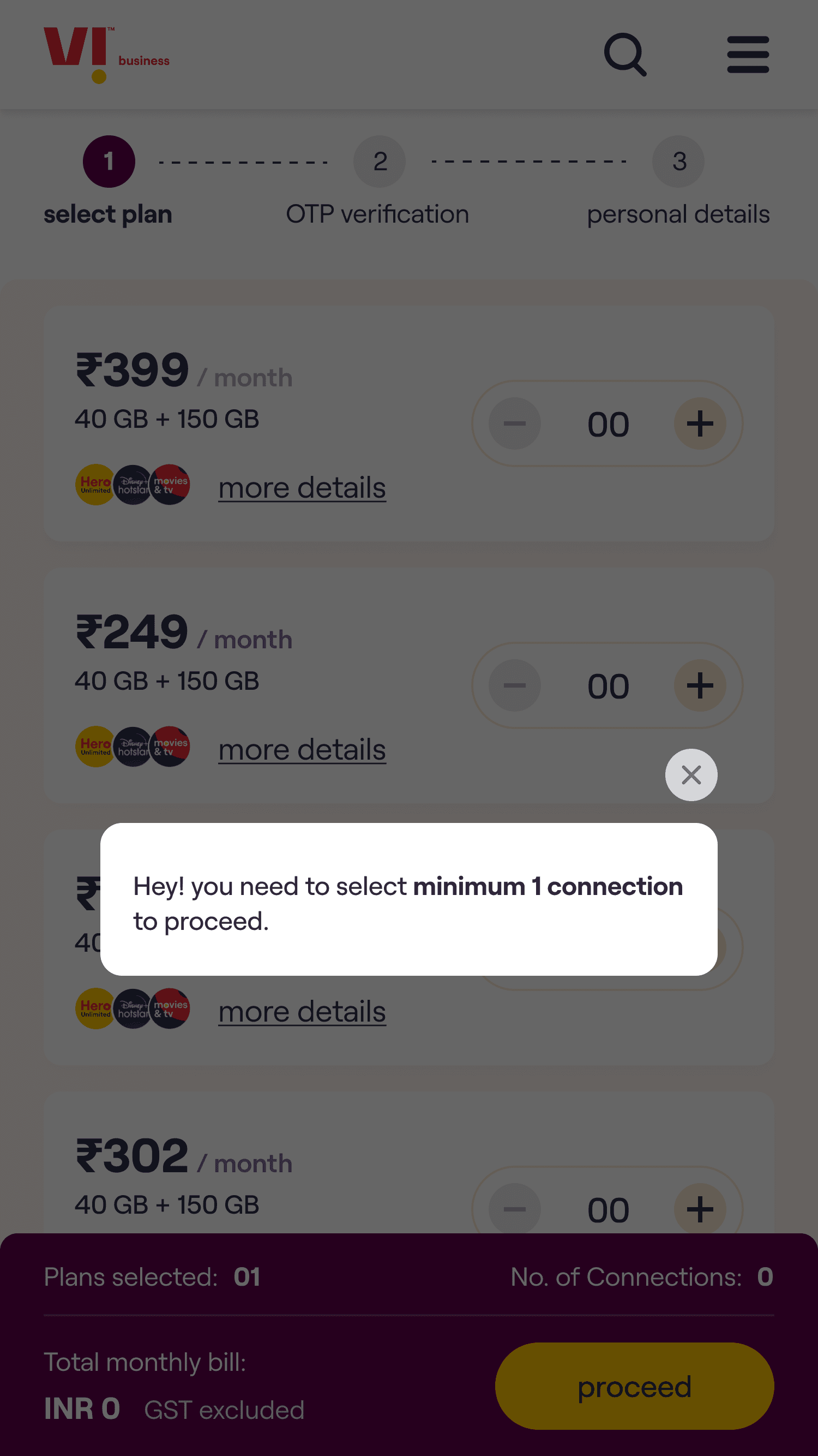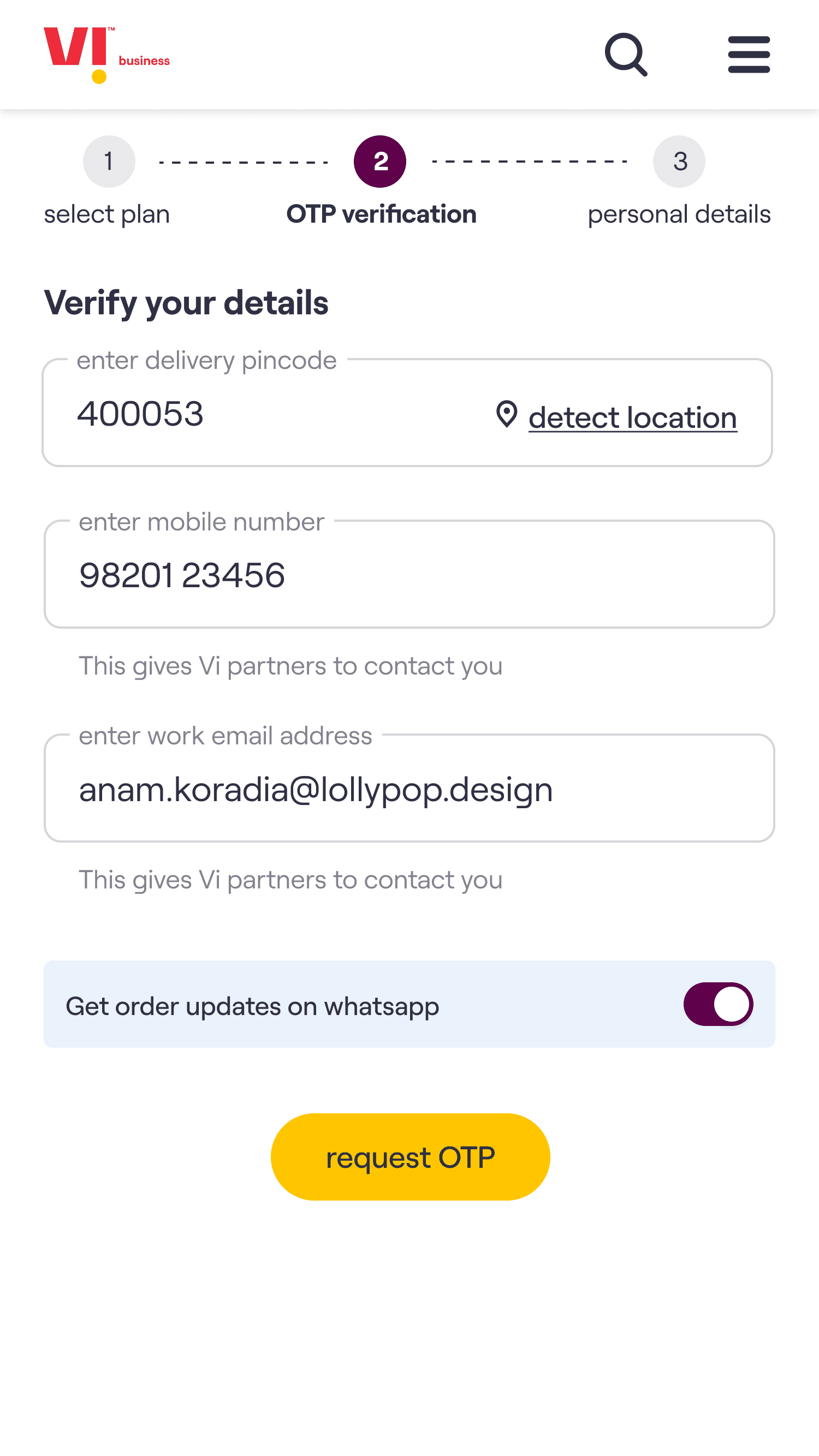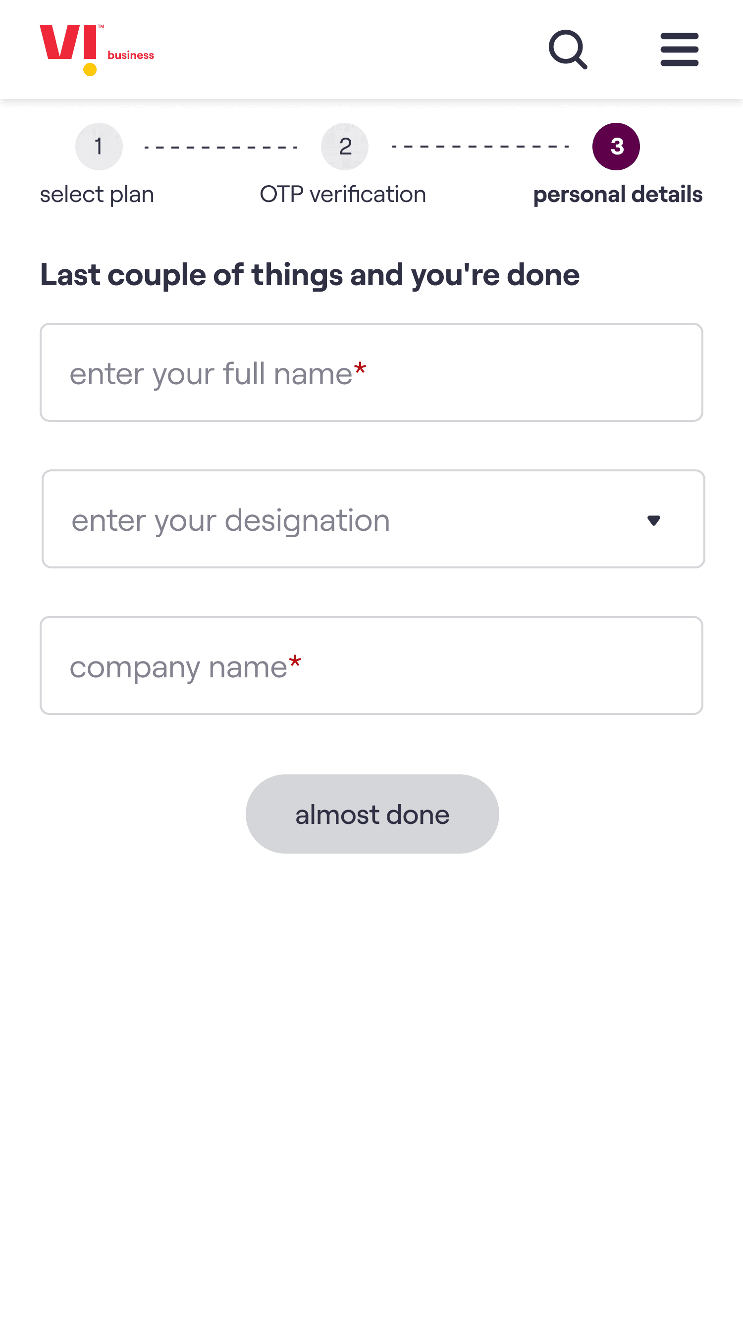 The core experience enables a customer to choose a plan, select the number of connections required & on submission of the request receive an acknowledgement email. The customer’s needs are then fulfilled by Vi Business team.
