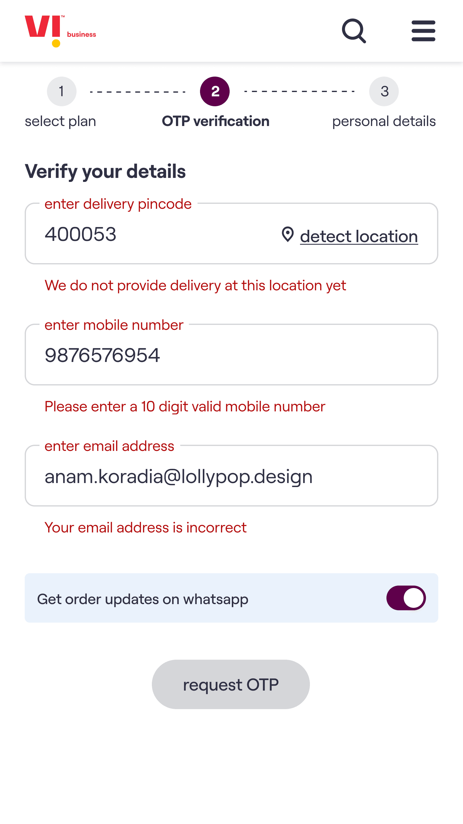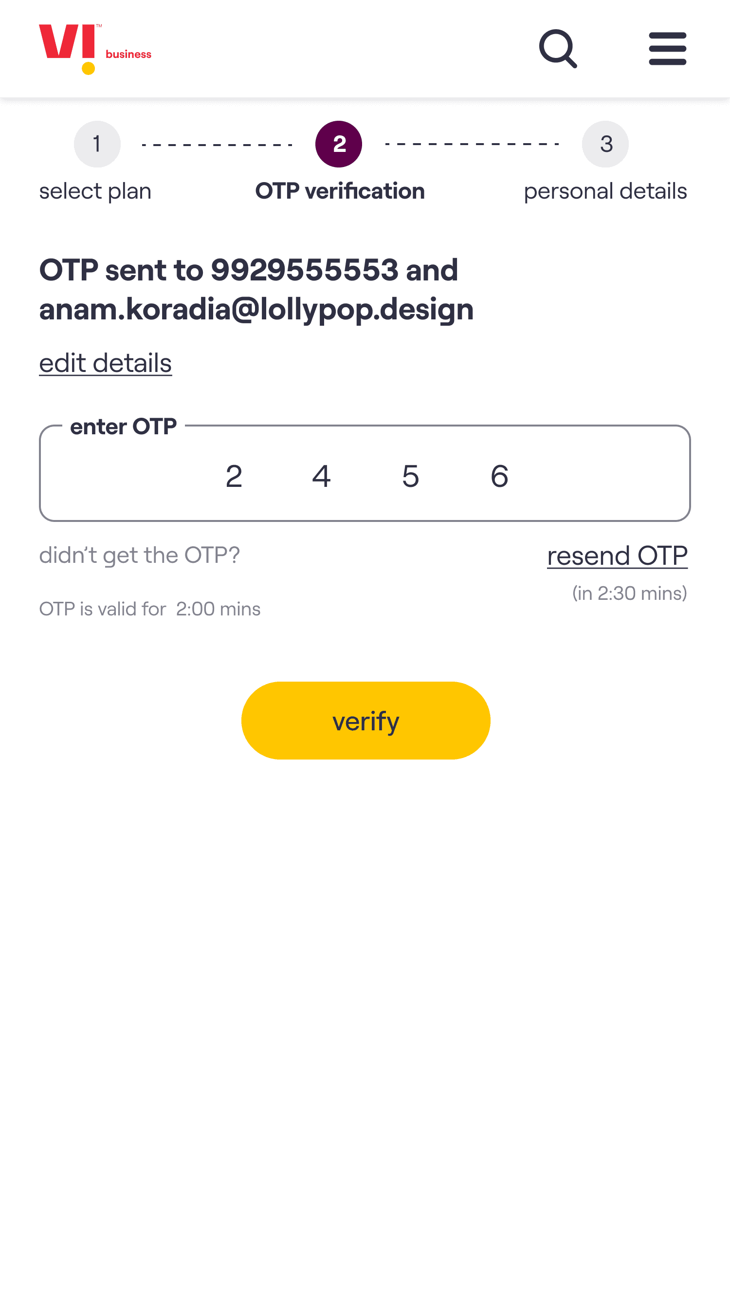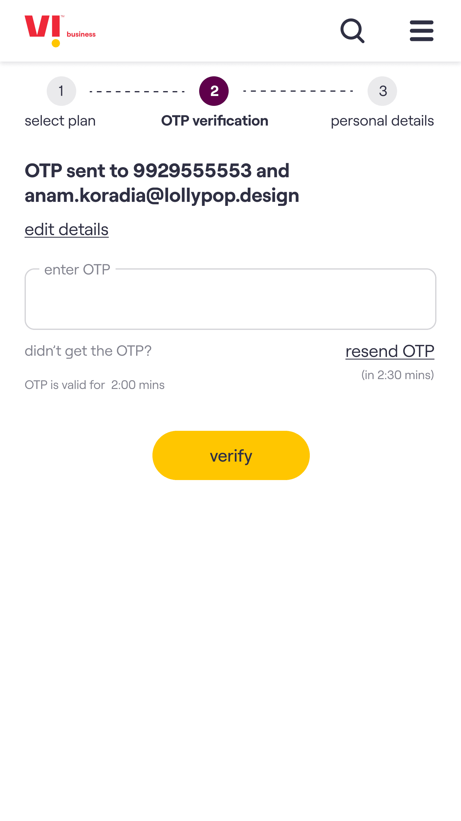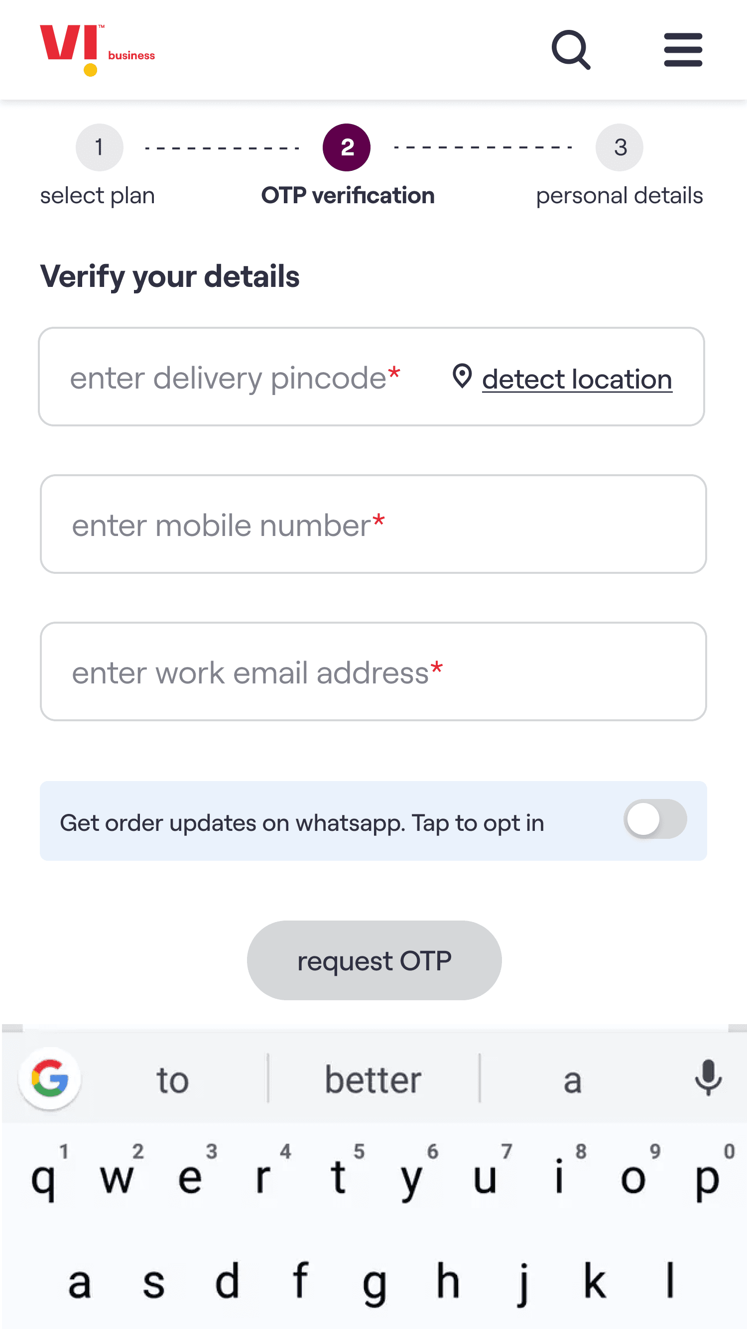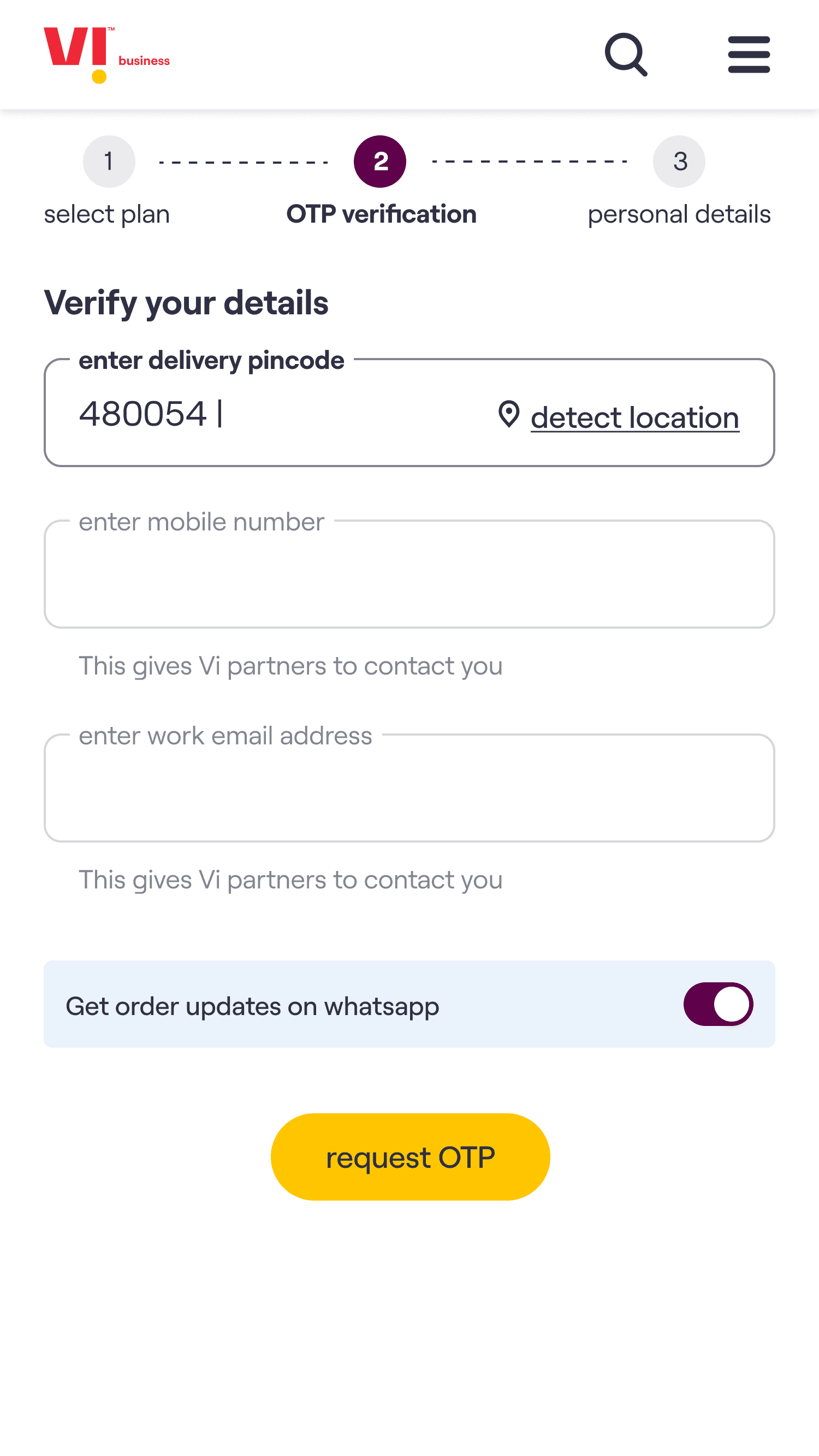The core experience enables a customer to choose a plan, select the number of connections required & on submission of the request receive an acknowledgement email. The customer’s needs are then fulfilled by Vi Business team.