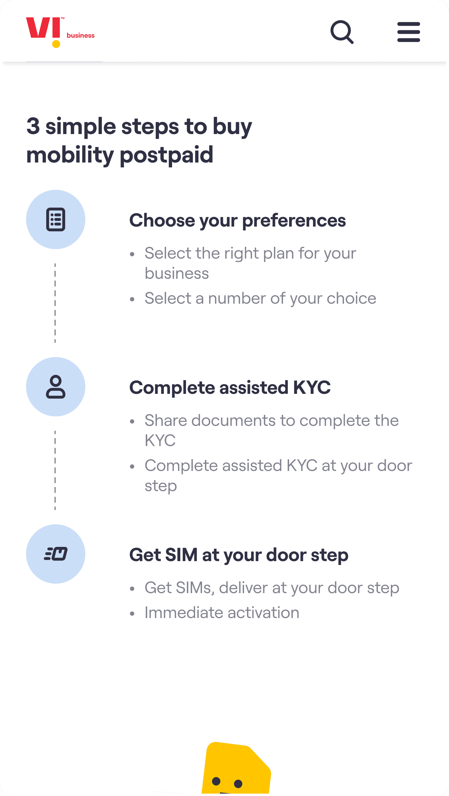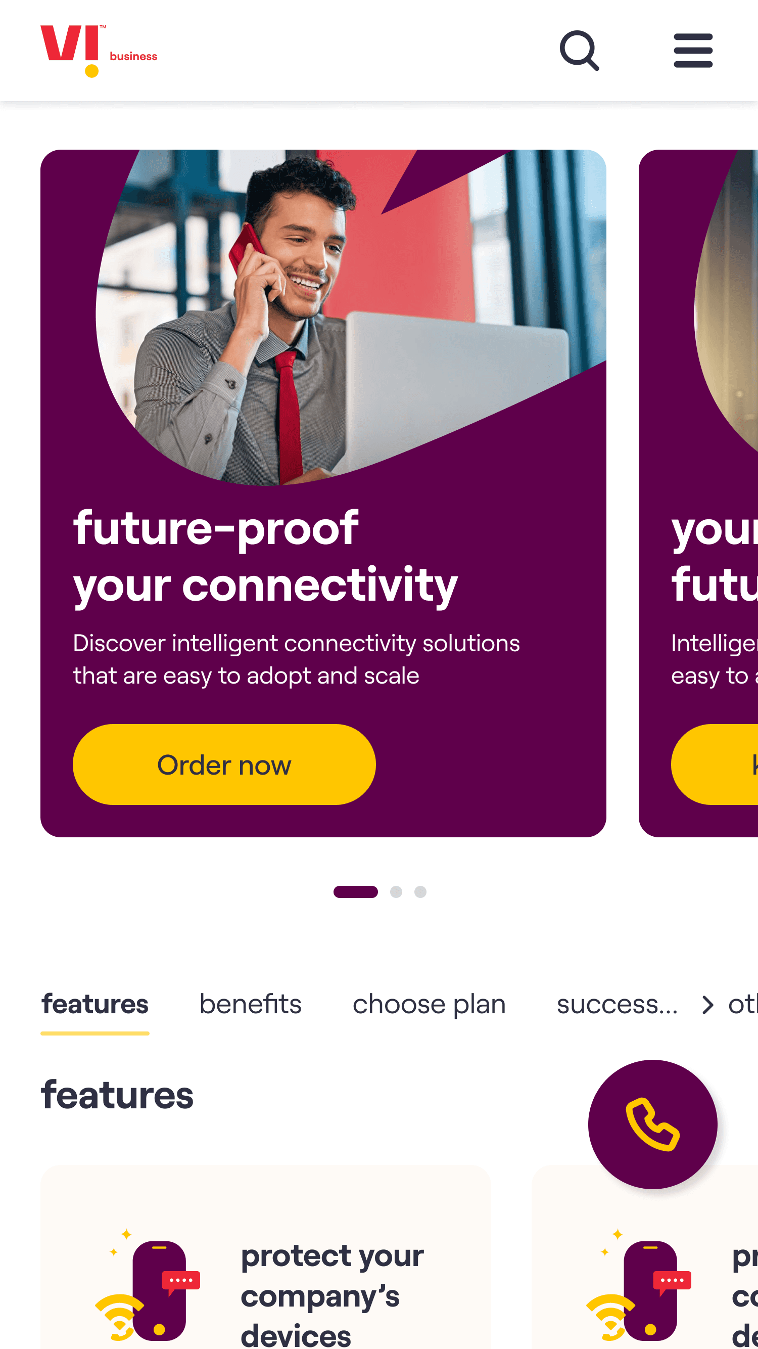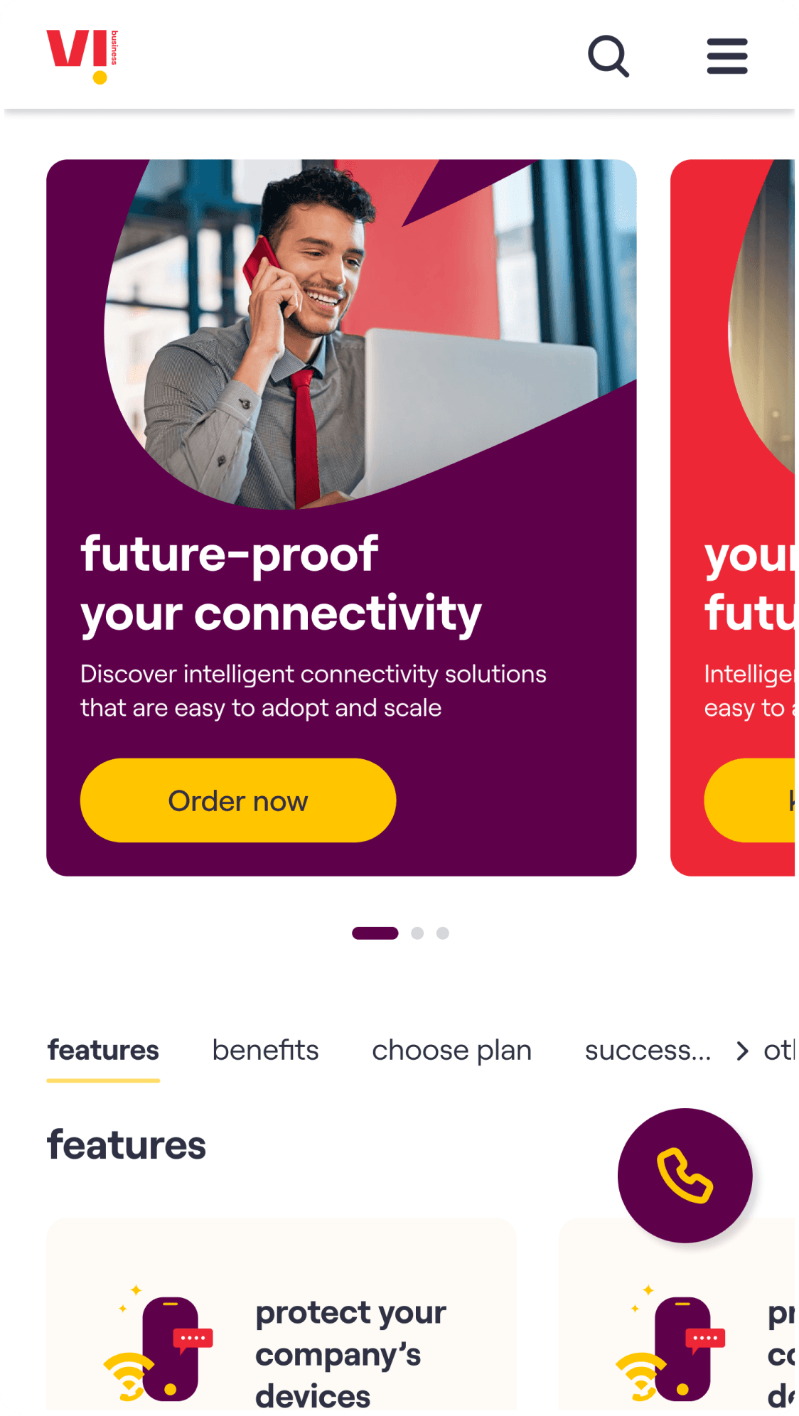 Vi business website landing page (mobile version)